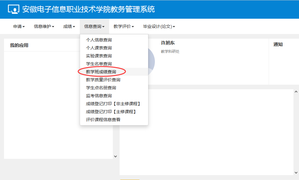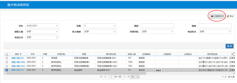 3.进入系统后,点击“信息查询”,选择“教学班成绩查询”,设置好查询学年学期,选中一条教学班记录,点击右上角“行政班打印”,即可查看此教学班学生成绩。