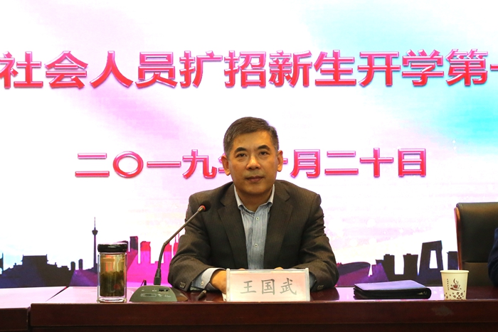 王国武首先对全体高职扩招新生的到来表示热烈的欢迎和衷心的祝贺。他指出,高职扩招是党中央、国务院作出的重大决策,既是稳定扩大就业的现实需要,也是加快建设现代化教育强国的战略需要,是落实《国家职业教育改革实施方案》的重要举措,还是解决技术技能人才短缺的战略之举,对国家发展和个人成长成才都具有非常重要的意义。