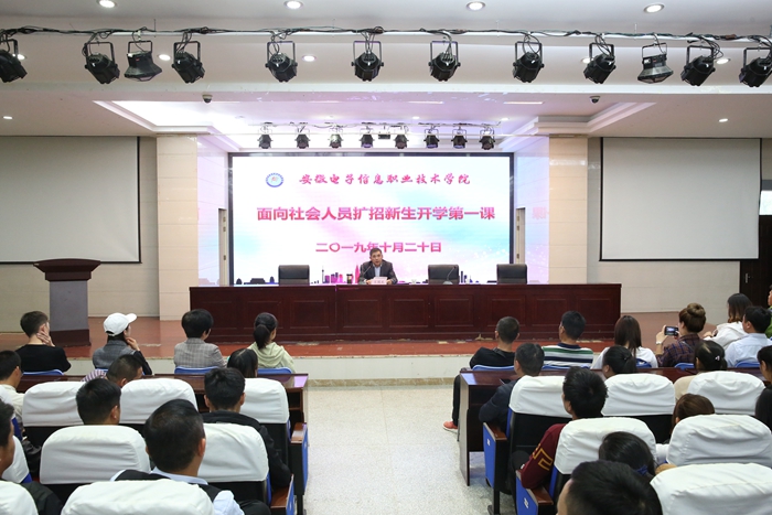 为深入开展爱国主义教育和革命传统教育,激励高职扩招学生技能成才、技能报国,10月20日下午,学院在信息中心学术报告厅举行2019年面向社会扩招新生“开学第一课”,党委副书记、院长王国武以“守初心匠心筑梦、担使命技能报国”为题讲授开学第一课。教务处处长闻学主持活动,各系(院)负责人、高职扩招班级辅导员参加活动,600多名高职扩招新生现场聆听开学第一课。