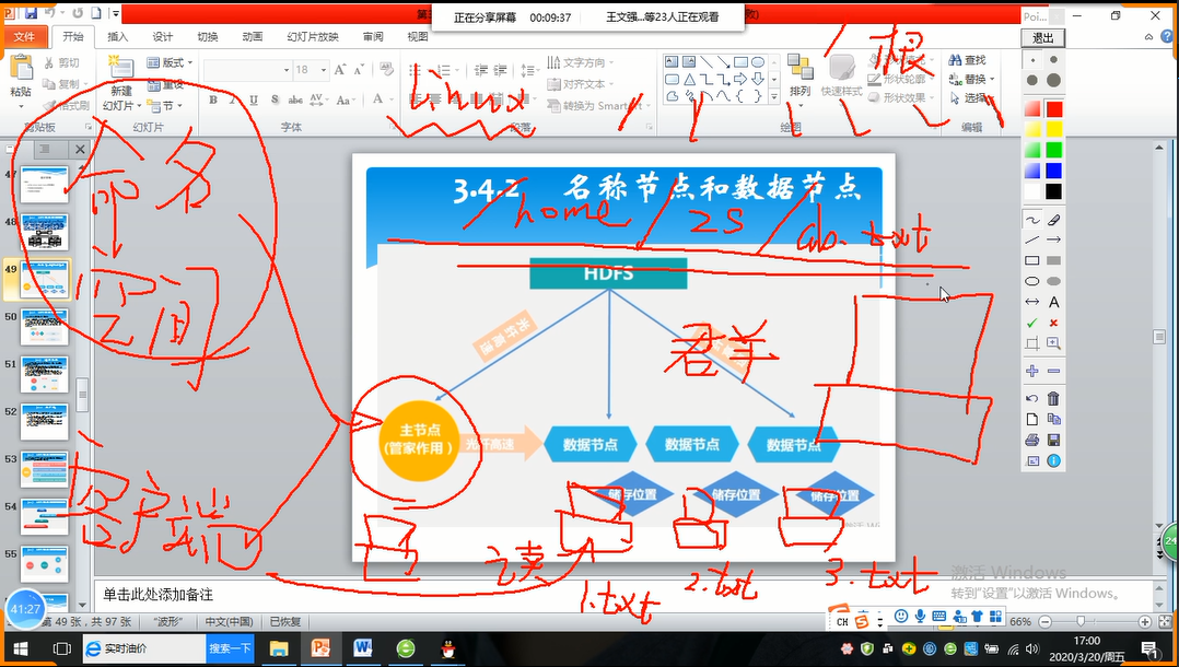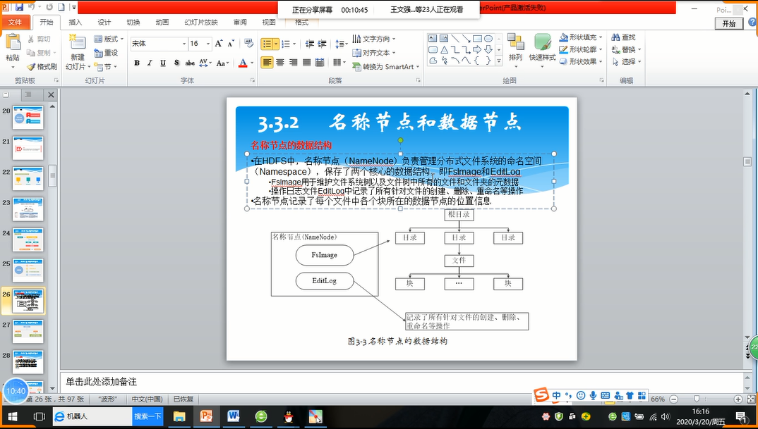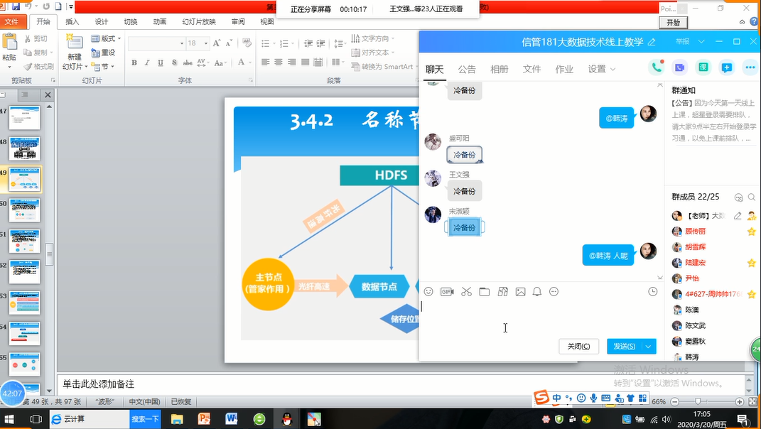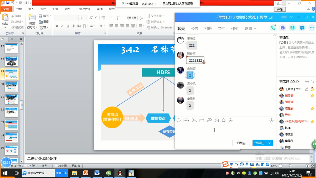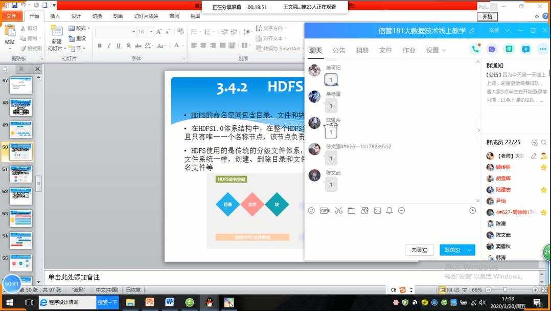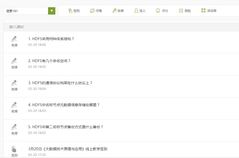 新冠疫情期间线上教学已开展一月,从最初的手足无措、一脸茫然,到摸着石头过河,不断的总结经验、教训,及时调整教学方式、教学进度,教学过程在不断的改进、丰富。现将近期《大数据技术原理与应用》线上教学过程汇报如下。