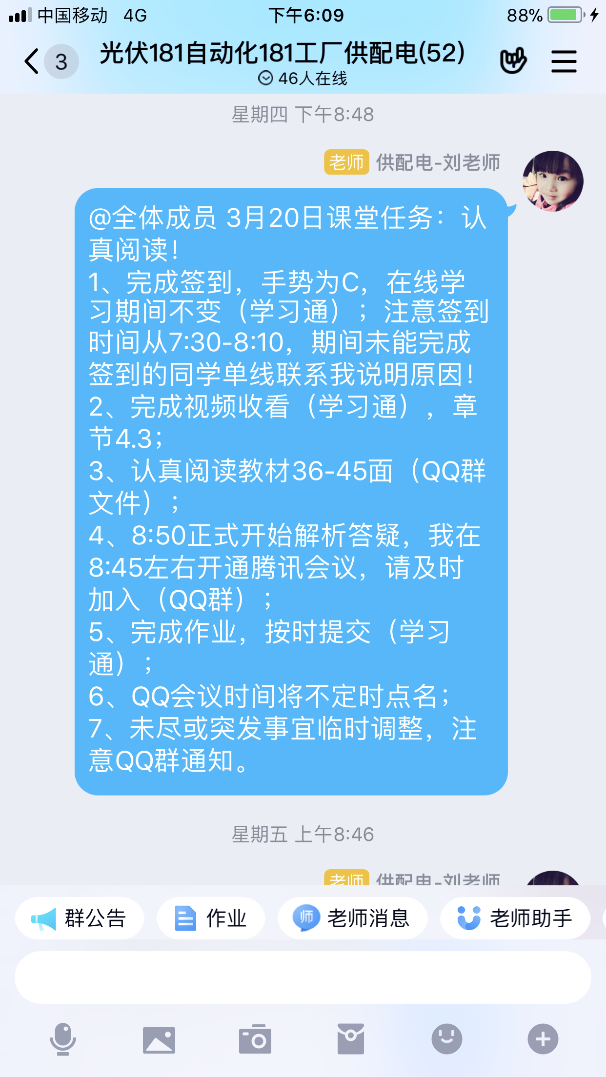 对于一门课程的传统教学而言,最基本的过程就在于课前预习、考勤签到、课堂讲授、课堂互动、完成作业和课后答疑。在此次的疫情中,大量的课程涌入线上,对于教师和学生而言都是一个不得不面对的挑战,对于各类线上教学平台来说,更是一个危机和机遇并存的挑战。在此过程中,我总结经验,选择合适的平台(QQ+超星学习通),将《工厂供配电技术》线上教学过程总结如下: