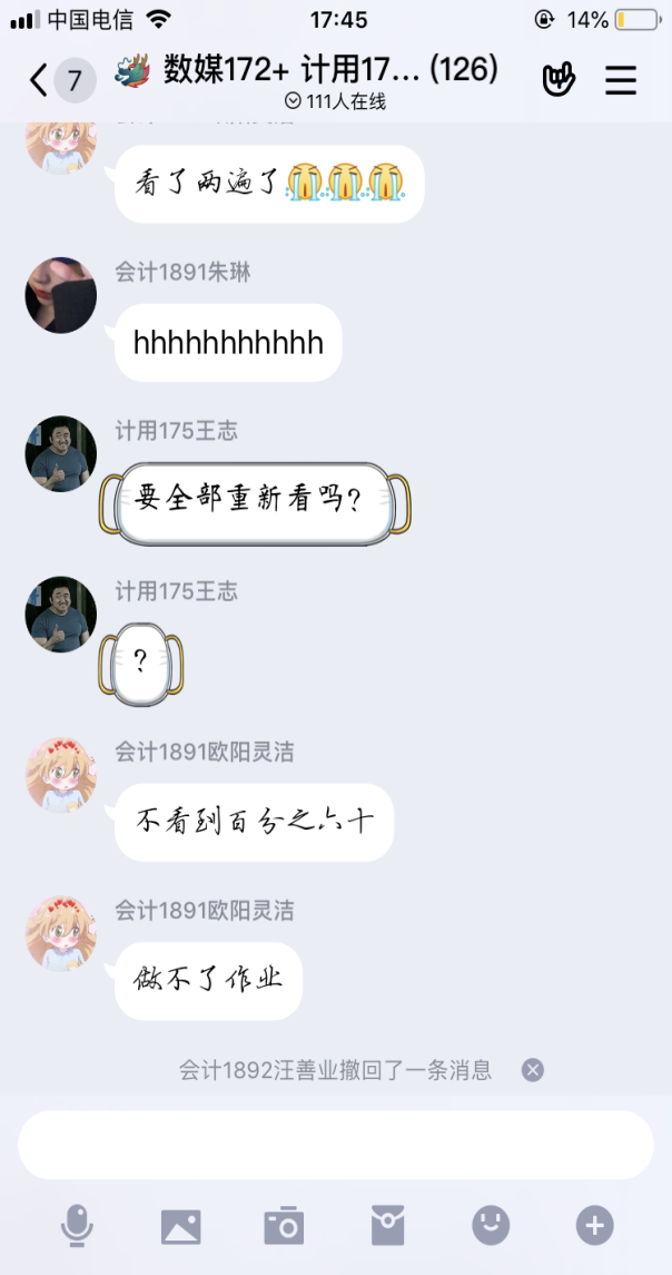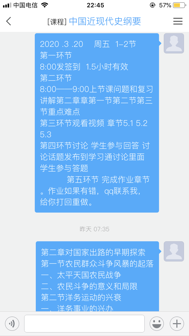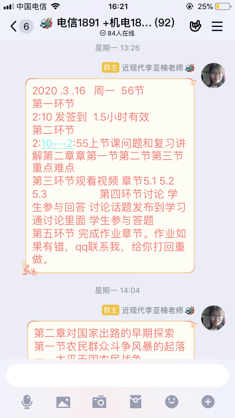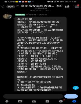 学生没有教材,课前预习分为两部分。一是按照教师要求,收看超星学习通中上传的教学视频;二是在QQ群文件中下载教师上传的教材照片,自行阅读。这一部分,课前一天,我会在QQ群中@所有人,提前分配第二天的任务。