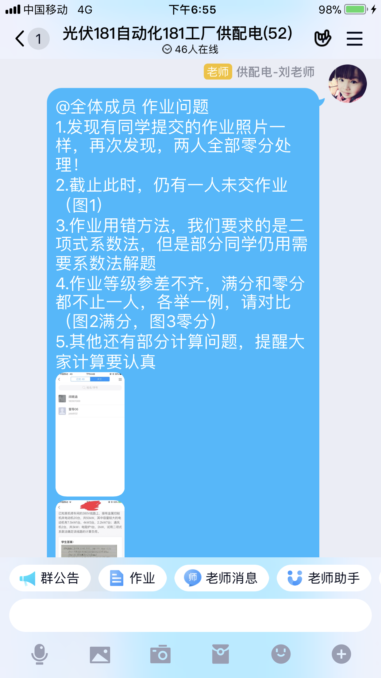 线上授课的过程产生的作业问题,通过两种方式解决,普遍问题在QQ群集中讲解,个别问题QQ私聊讲解,力争为每一位同学解答每一个问题。
