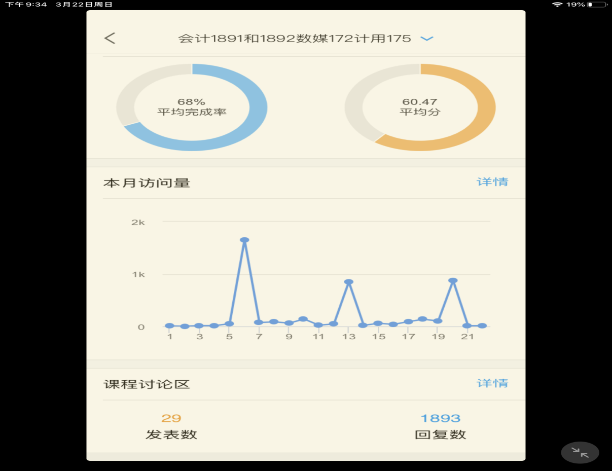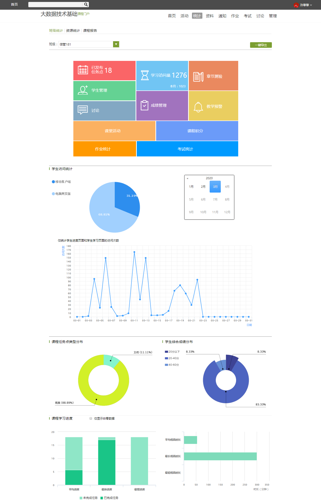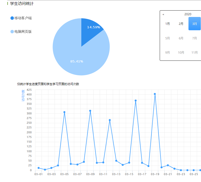 学生访问量较高,学习频次与课程时间吻合,多数同学选择使用电脑上课,学习质量较高,资源学习完成率较高。
