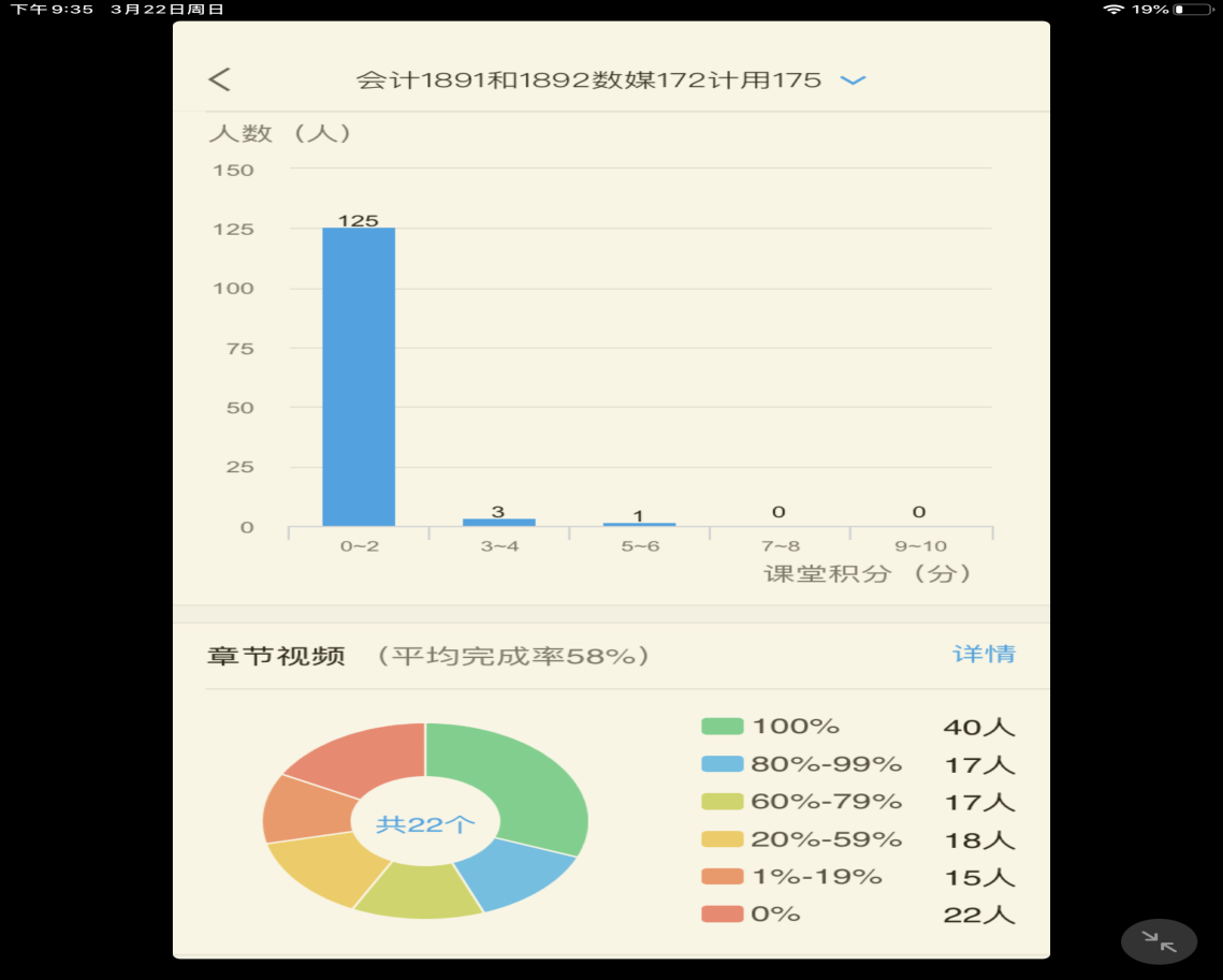 在平台选用方面,采用了学校统一的超星学习通软件,在软件上建立《财务报表分析》课程相关资源,截止目前访问总量为157097,使用同学共6个班级,250名同学,生均访问量628.38。发布作业数共15次,其中包含课堂练习和课后作业。因为不能直接使用上机资源,我通过采取将上机资源中的计算题、图表题等转换为选择题、填空题的形式让学生练习,这样等到回到学校开始线下授课进行上机训练的时候,会减轻一部分压力。共发布3次相关讨论,每一次参与人数在200次以上。每个班级利用学习通在课堂上发布活动数共11次,参与这些活动会获得对应课堂积分。章节内容当中除了自己制作的PPT,还使用了视频录制软件亲自提前录制一部分授课视频,这部分视频在上课的过程中作为任务点,让同学们在课堂上规定时间内完成,完成之后获得对应积分。自己录制视频既可以拉近与学生的距离,也可以更加贴近自己的授课内容,相比使用已有资源更有优势。