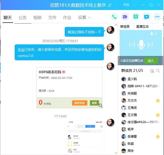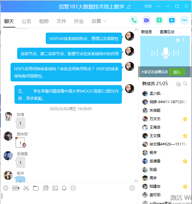 《大数据技术原理与应用》线上学习目前主要采用学习通学习资料任务发布、签到、抢答、讨论、作业、考试,中国MOOC平台课程视频观看学习,QQ语音电话屏幕分享在线指导学生、知识点讲解、重难点解析、提问互动、作业总结答疑的方式交叉进行。