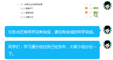 通过任务点完成情况统计数据,了解学生自学完成情况,对没有完成的学生通过qq等聊天工具进行提醒和督促。自学完成后,学生参与主题讨论、测验等活动,查看学生观点,了解学生的认知情况,以便有重点的设计课上任务。
