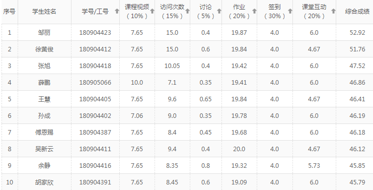 课堂考核以积分的方式体现,学习教学资源,参与课堂活动,完成作业在积分总分中均有一定比例的占比,每节课公布课堂表现排名,激发学生学习积极性,对优秀作业、优秀答案进行讲评和鼓励,提高学生课堂活动的参与度,推动学生线上学习的反馈,促进师生之间线上良性互动。