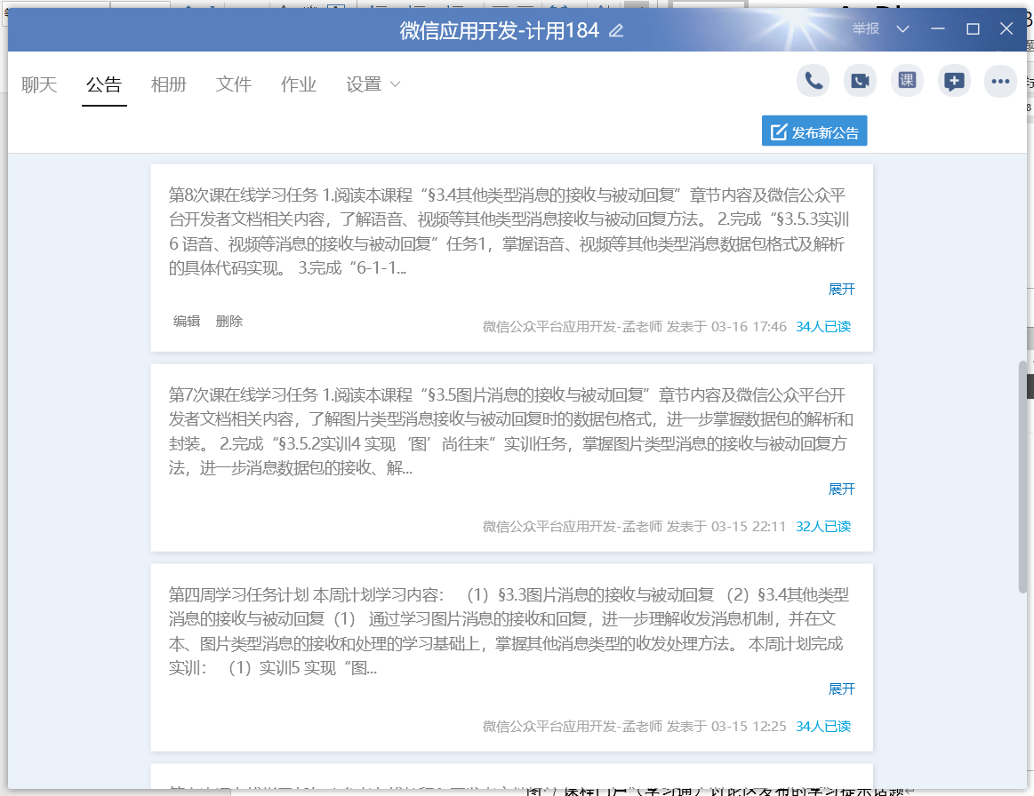 图 7 QQ课程学习群发布的每周学习计划、每次课学习任务公告