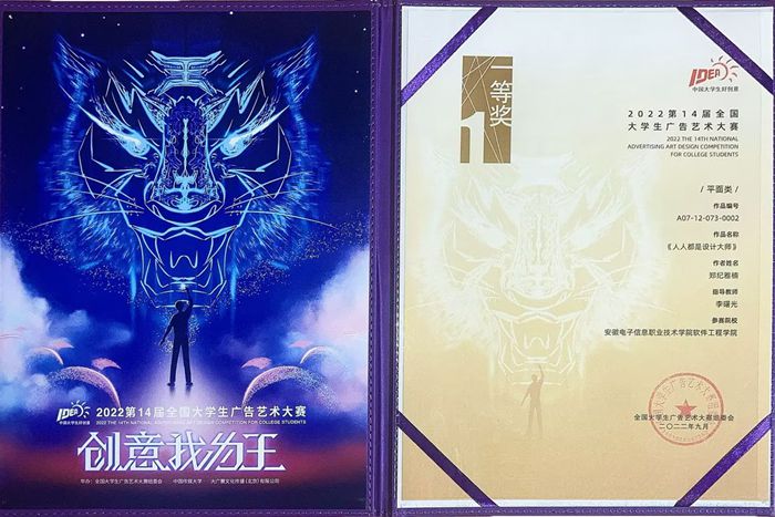 本网讯 近日,2022年第14届全国大学生广告艺术大赛组委会邀请了动漫201班的郑纪雅楠同学参加今年的颁奖典礼,据悉,我院此次参赛作品共获得全国一等奖1项,二等奖1项、三等奖2项,其中,李曙光老师指导的郑纪雅楠创作的作品《人人都是设计大师》获得了全国一等奖。是历年来我院参加此类竞赛获得等级奖最高、获奖数量最多的一届。