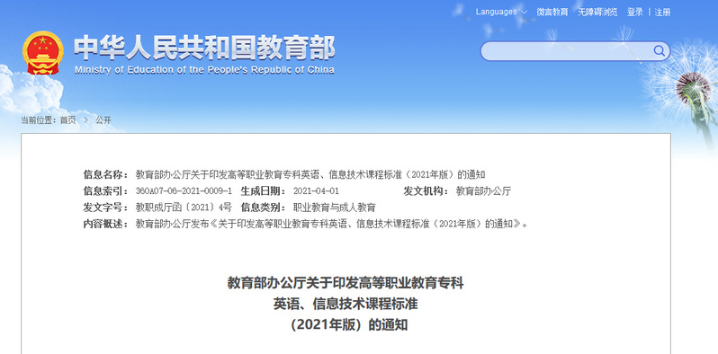 3、高等职业教育专科英语、信息技术课程标准(2021年版)