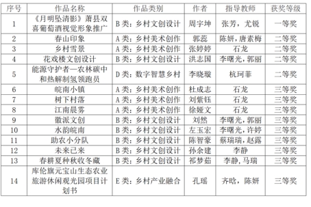 本次大赛由安徽省农业农村厅、安徽省乡村振兴局、安徽省教育厅、安徽省住房和城乡建设厅、安徽省人力资源和社会保障厅等多家单位共同主办,参赛对象分为高校组与社会组,高校组为安徽省内普通高校全日制在校学生(本专科生和研究生),社会组为安徽省内各级政府、社会团体和企业,共征集了参赛作品高校组7594件,社会组649 件。本次比赛参赛院校多,选手水平高,竞争激烈。学院师生团结协作,利用课余时间,以饱满的热情投入到备赛中,做到严格要求、刻苦训练,不断完善作品、精益求精,最终以优异的成绩获得了荣誉,为学院增光添彩。