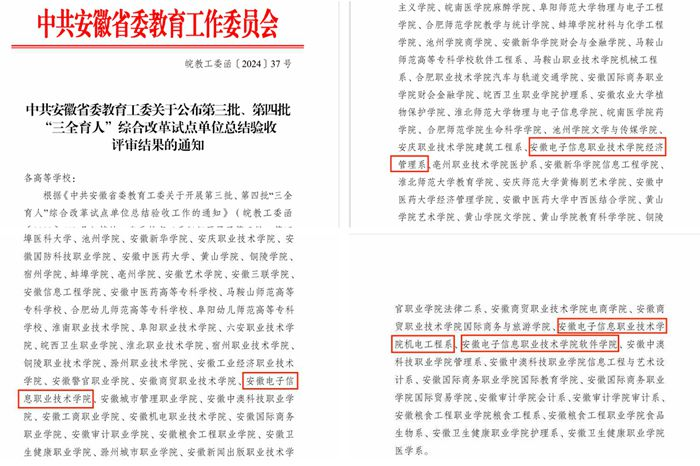 本网讯 近日,省委教育工委公布安徽省第三批、第四批“三全育人”综合改革试点单位总结验收评审结果,必赢766net手机版顺利通过高校类,经济管理学院、机电工程学院、软件工程学院顺利通过院系类总结验收。