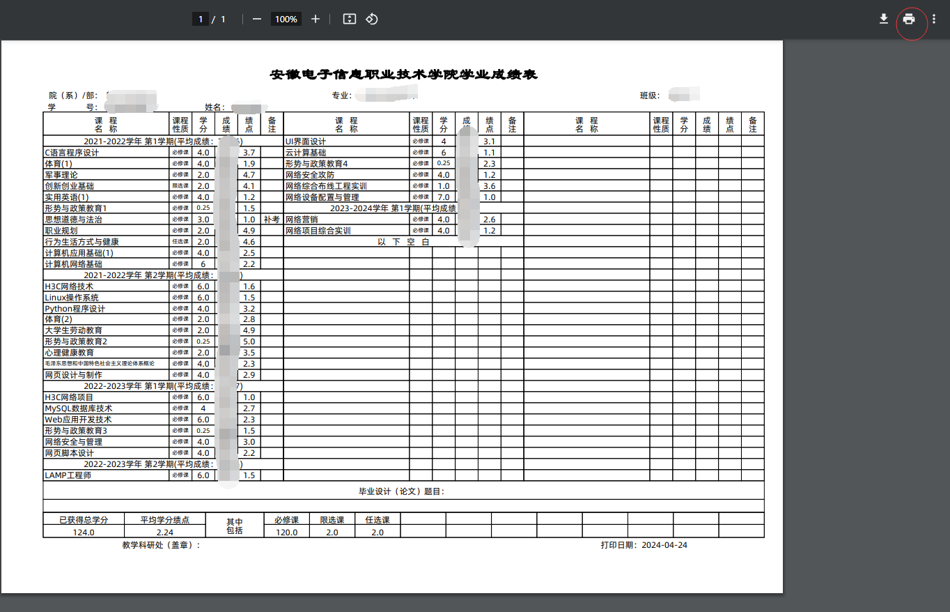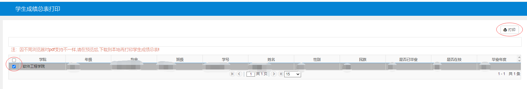 3. 勾选个人信息按钮,右上角点击“打印”即可查看学业成绩总表,总表查看界面点击按钮可打印个人学业成绩单。