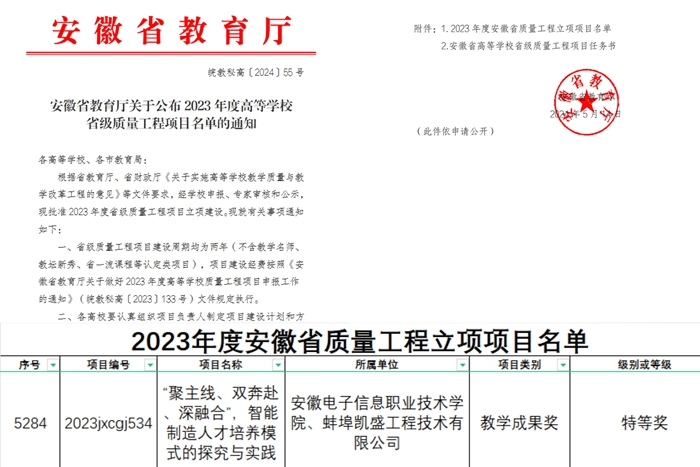 本网讯 日前,从安徽省教育厅《关于公布2023年度高等学校省级质量工程项目名单的通知》获悉,学院申报的《“聚主线、双奔赴、深融合”,智能制造人才培养模式的探究与实践》教学成果,荣获安徽省教学成果奖---特等奖。