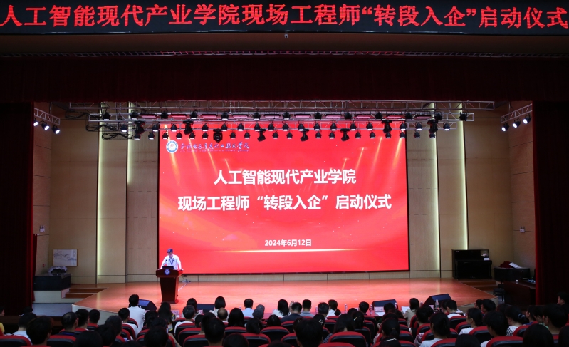 为深入落实教育部等五部门关于实施职业教育现场工程师专项培养计划的部署要求,持续深化产教融合、校企合作,6月12日下午,学院举行人工智能现代产业学院现场工程师“转段入企”启动仪式。软件工程学院党政负责人,人工智能现代产业学院理事单位代表,合作企业代表及部分师生代表参加活动。活动由人工智能现代产业学院副院长胡六四主持。