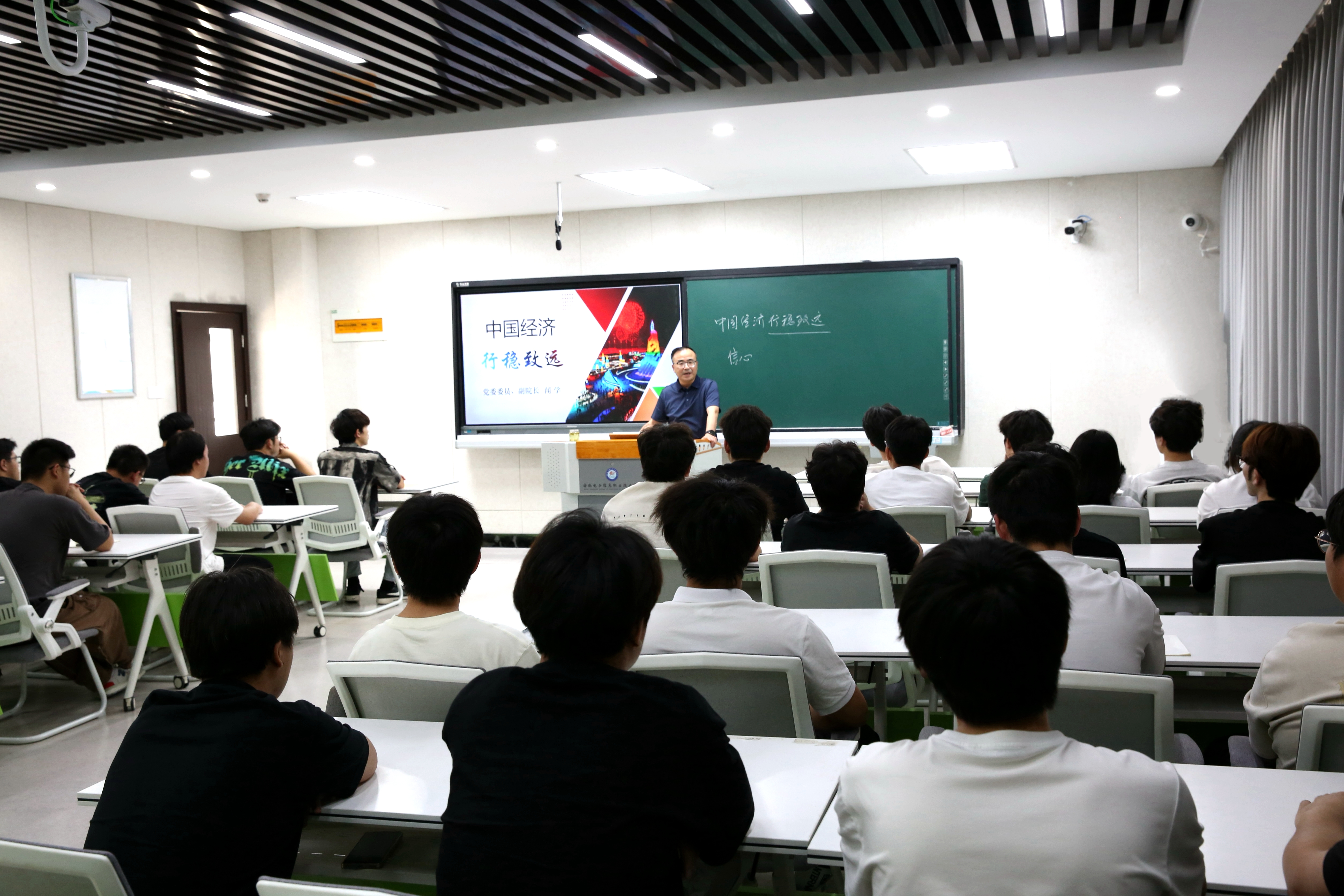 闻学以“中国经济行稳致远”为题,在信息中心南202教室为软件工程学院网络243班学生讲授“形势与政策”课。闻学通过详实的数据和案例,讲授了中国经济发展信心之源、中国经济迎难而上的内在规律和宝贵经验、中国经济奋楫向前的重点任务等内容,深入浅出阐释了中国经济行稳致远的理论依据和实践支撑。闻学结合学生专业特点,鼓励同学们紧紧抓住人工智能发展的战略机遇,将个人发展与国家战略需求紧密结合,努力学习专业知识,培养创新思维与实践能力,让青春在构建现代化产业体系的赛道上绽放光彩。