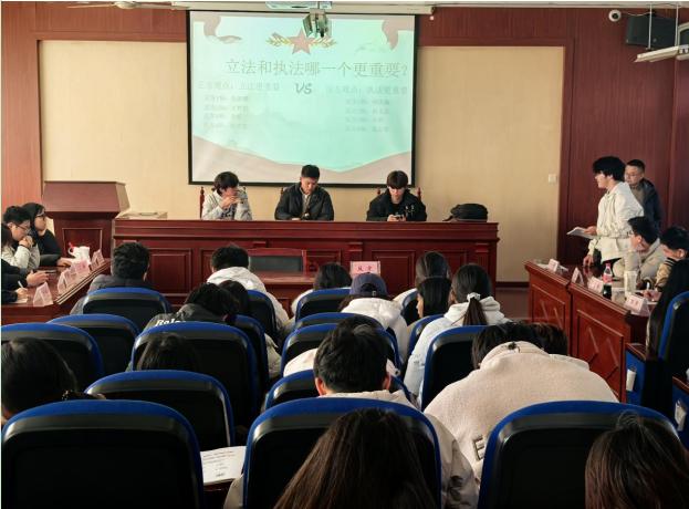 争分夺秒的知识竞赛后迎来唇枪舌剑的法律辩论。围绕“立法和执法哪一个更重要”,正方以 “立法是法治建设的源头活水”立论 ,反方从 “执法是法治落地的‘最后一公里’” 打入,双方在激烈交锋中迸发法律思想的火花。