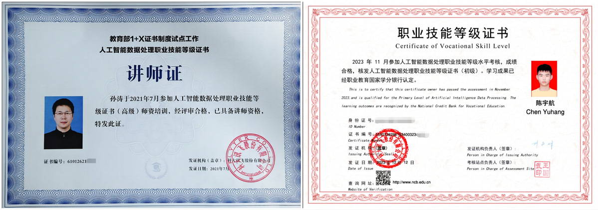 人工智能训练师、计算机视觉实施工程师、Python高级软件工程师、1+X 人工智能数据处理、1+X Web前端开发工程师、1+X 计算机视觉职业技能等级证书(初级)。