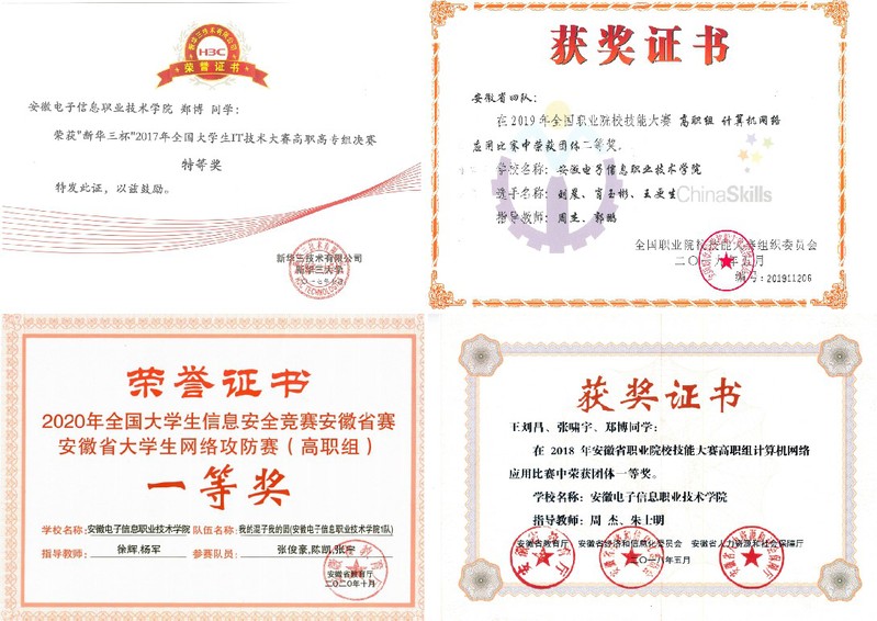近年来本专业培养的学生获得了全国H3C杯网络大赛特等奖1次,全国职业技能大赛二等奖3次、三等奖1次、其他全国性A类赛事二等奖1次、三等奖3次,安徽省职业技能大赛一等奖7次和省级其他B类赛事一等奖10余次,其他奖项若干。