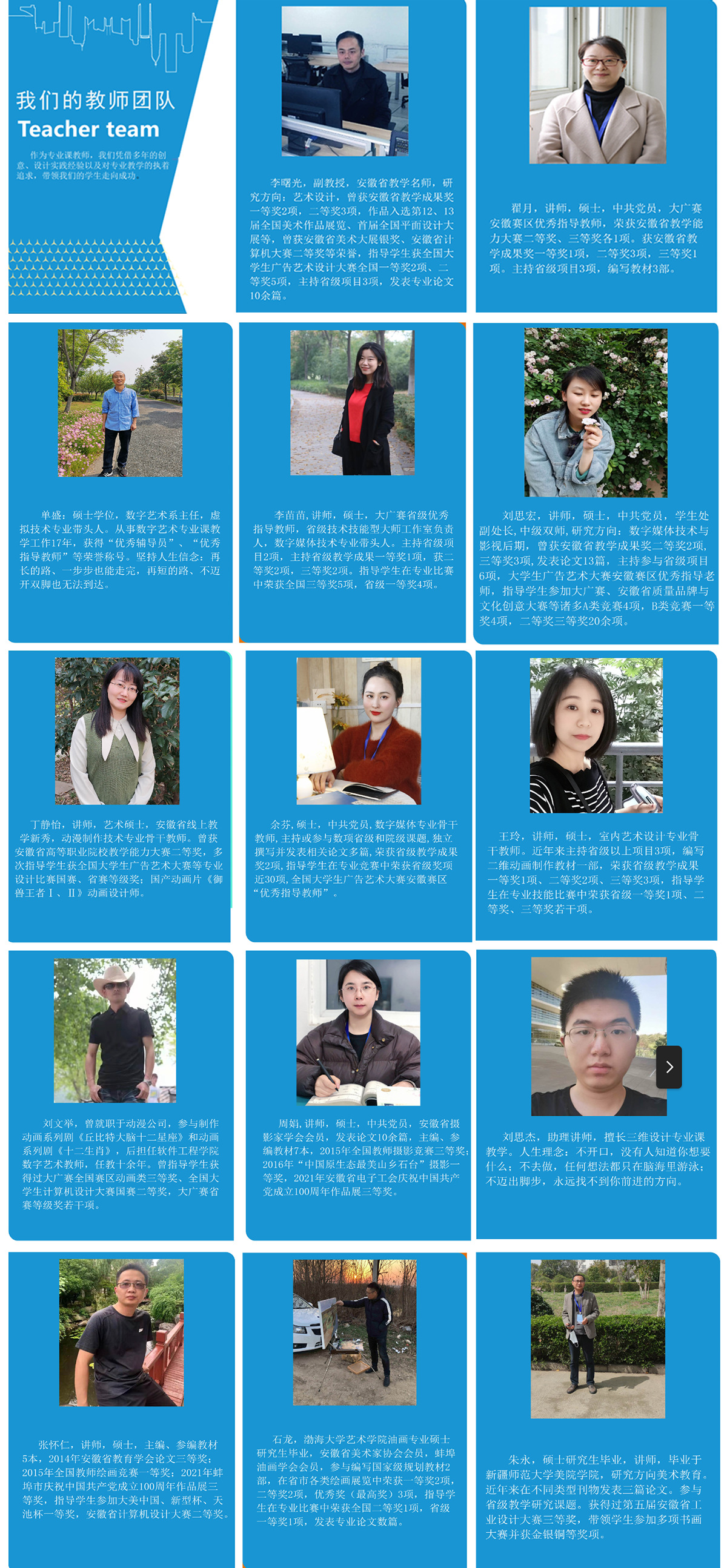 l 数字艺术教学模式连续四年荣获安徽省教学成果一、二、三等奖若干、成立大师工作室。