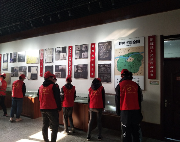 后,志愿者们来到了烈士陈列馆。辛亥革命以来,蚌埠地区人民积极投入到反帝反封建的革命斗争中,涌现出了大批革命烈士。关于他们英勇事迹的各种图片、实物及资料,都在馆内陈列着,向前来瞻仰的人们无声地讲述着中国人民艰苦卓越的革命历程,让人无限动容。