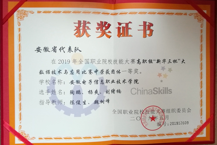 本网讯 2019年全国职业院校技能大赛高职组“新华三杯”大数据技术与应用赛项于6月13日在贵阳轻工职业技术学院举行,由学院教师陈俊生、魏树峰指导,学院学生陶鹏、刘绪楠、杨爽组成的竞赛团队,代表安徽省参加角逐,喜获团体一等奖。