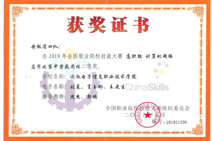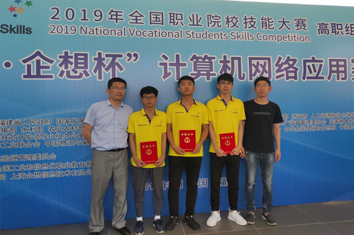 本网讯 6月16日,2019年全国职业院校技能大赛高职组计算机网络应用赛项在福建信息职业技术学院圆满落幕,由学院刘晨、肖玉彬和王更生等三名学生组成的安徽省四队,在比赛中奋力拼搏,荣获团体二等奖。