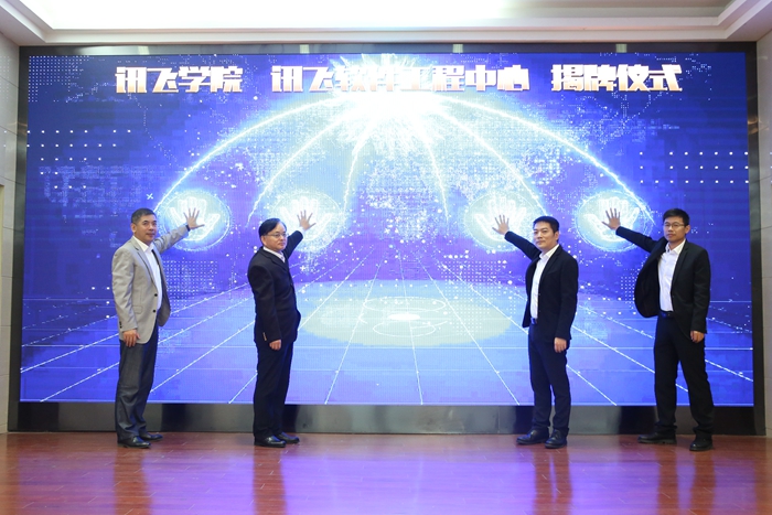 学院党委书记石象斌、陈涛、王国武、董飞共同为讯飞学院、讯飞软件工程中心揭牌,揭牌仪式在现场热烈的掌声中落幕。