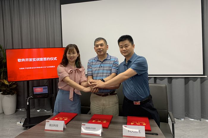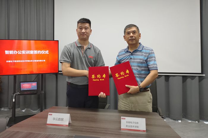 本网讯 8月24日,学校与华云数据控股集团有限公司共建智能办公实训室,与科大讯飞股份有限公司、安徽雄品智能科技有限公司共建软件开发实训室签约仪式在中国声谷举行。安徽省经信厅软件服务业处处长余要火,党委副书记、校长王国武,党委委员、副校长姚卿佐,华云数据控股集团高级副总裁丛培勇、安徽省公司总经理王建宏,科大讯飞高教人才培养业务线副总裁陈琦,雄品智能科技总经理刘瑾等领导出席签约仪式。