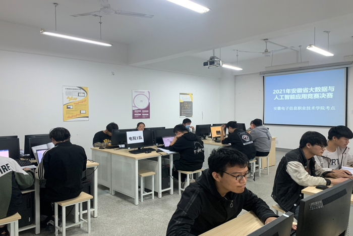 2021年安徽省大数据与人工智能应用竞赛由安徽省教育厅主办,合肥幼儿师范高等专科学校承办,共有来自省内20余所高职院校的63支队伍参赛。根据疫情防控需要,今年决赛采用分布式赛场、参赛学校互派巡考的方式进行。