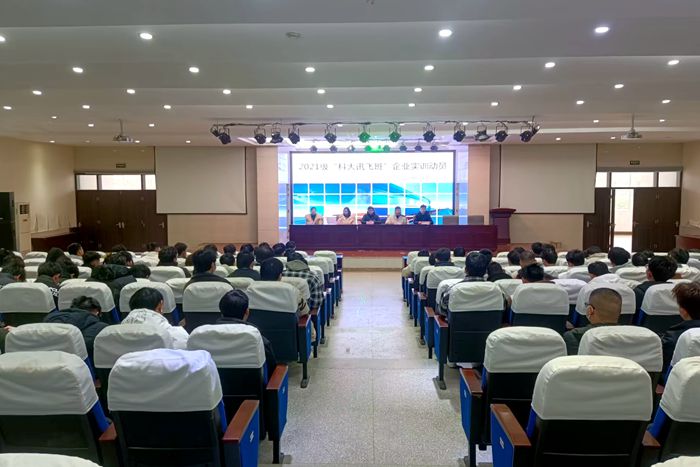 本网讯 2月13日下午,软件工程学院在信息中心报告厅召开了2021级科大讯飞班企业实训动员会,会议由软件技术教研室主任胡六四主持,科大讯飞工程师王金雨、潘辉,软件技术专业带头人彭莉芬、骨干教师刘影和全体2021级科大讯飞班同学参加会议。