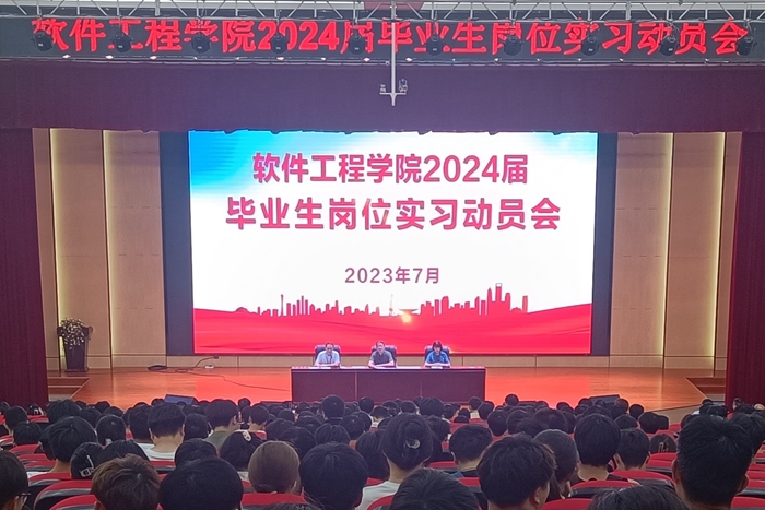 本网讯 为促进岗位实习工作的开展,7月12日下午,软件工程学院在实验楼报告厅组织召开2024届毕业生岗位实习动员会。软件工程学院党总支书记周伟利、院长夏克付、副院长郭丽出席会议,岗位实习指导教师、毕业班辅导员和2024届毕业生参加会议。会议由郭丽主持。