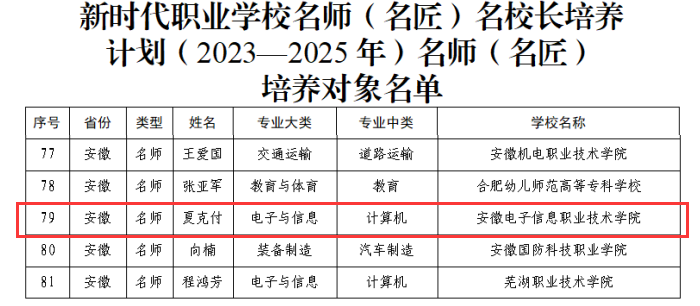 本网讯 近日,教育部办公厅下发了《关于公布新时代职业学校名师(名匠)名校长培养计划(2023—2025年)培养对象和培养基地名单的通知》(教师厅函〔2023〕23 号),学院夏克付教授成功入选新时代职业学校名师培养对象。
