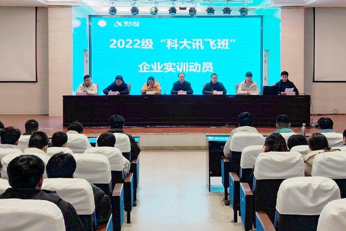 本网讯 2月28日下午,软件工程学院在信息中心报告厅召开2022级科大讯飞班企业实训动员会。软件工程学院党总支书记周伟利、科大讯飞股份有限公司高教人才培养业务线华东大区总监彭飞、高教人才培养业务线项目经理沈文波、前端开发工程师王金雨,软件技术专业带头人王林、彭莉芬和全体2022级科大讯飞班同学参加会议。会议由软件技术教研室主任胡六四主持。