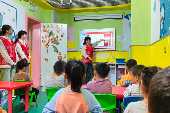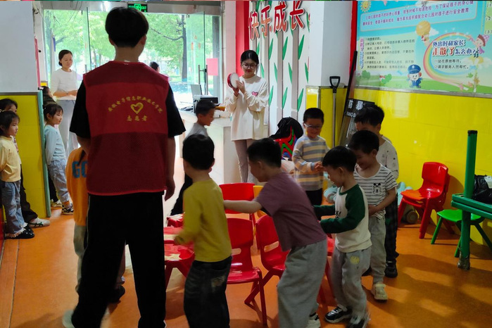 随后是游戏环节,志愿者们设计了多种有趣的小游戏,如天气预报、123木头人、抢凳子等,让小朋友们在玩游戏中积累知识和技能,培养语言和协作能力,同时也促进了小朋友们之间的互动和交流。还有志愿者负责教学,他们教授小朋友们一些手势舞和儿歌,引导小朋友们跟着节拍做出动作,发挥自己的创造力和想象力,营造出欢快的氛围和场景。