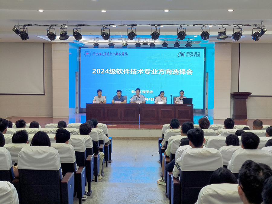 本网讯  9 月 4 日上午,软件工程学院在信息楼学术报告厅召开了 2024 级软件技术专业方向选择会。软件技术专业带头人彭莉芬、王林,科大讯飞股份有限公司项目经理王金雨,专任教师李曼玉和2024 级软件技术专业全体新生参加了方向选择会。会议由软件技术教研室主任胡六四主持。