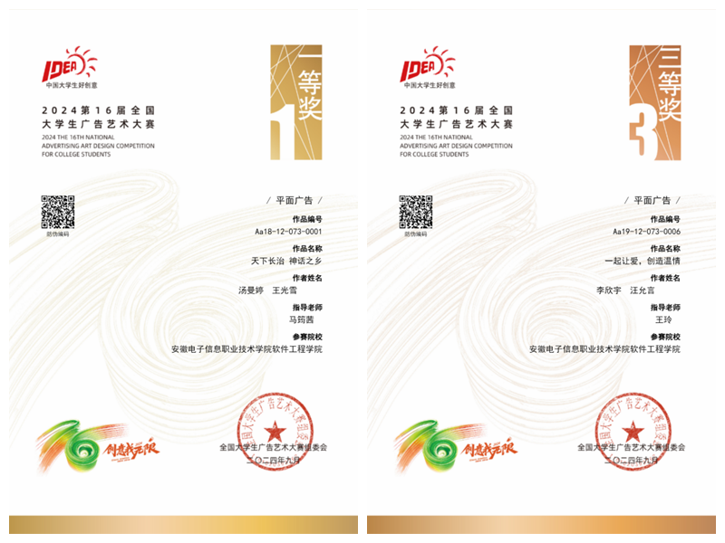 本网讯        近日,2024年第16届全国大学生广告艺术大赛获奖名单已公布,软件工程学院室内艺术设计专业汤曼婷、王光雪同学的作品《天下长治神话之乡》荣获全国一等奖;这已是学院第三次荣获大广赛全国一等奖。动漫制作技术专业李欣宇、汪允言同学的作品《一起让爱,创造温情》荣获全国三等奖。