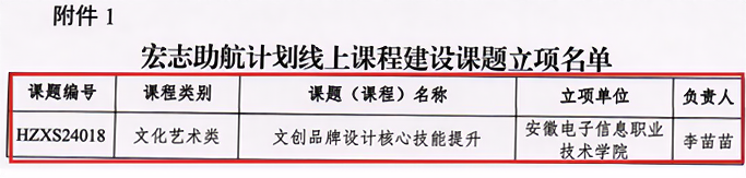 本网讯        近日,教育部学生服务与素质发展中心公布了宏志助航计划线上课程建设课题立项通知,软件工程学院李苗苗团队申报的《文创品牌设计核心技能提升》课题成功获批立项。全国共立项22项课题,高职院校6项,我院是安徽省唯一获得立项的高职院校。