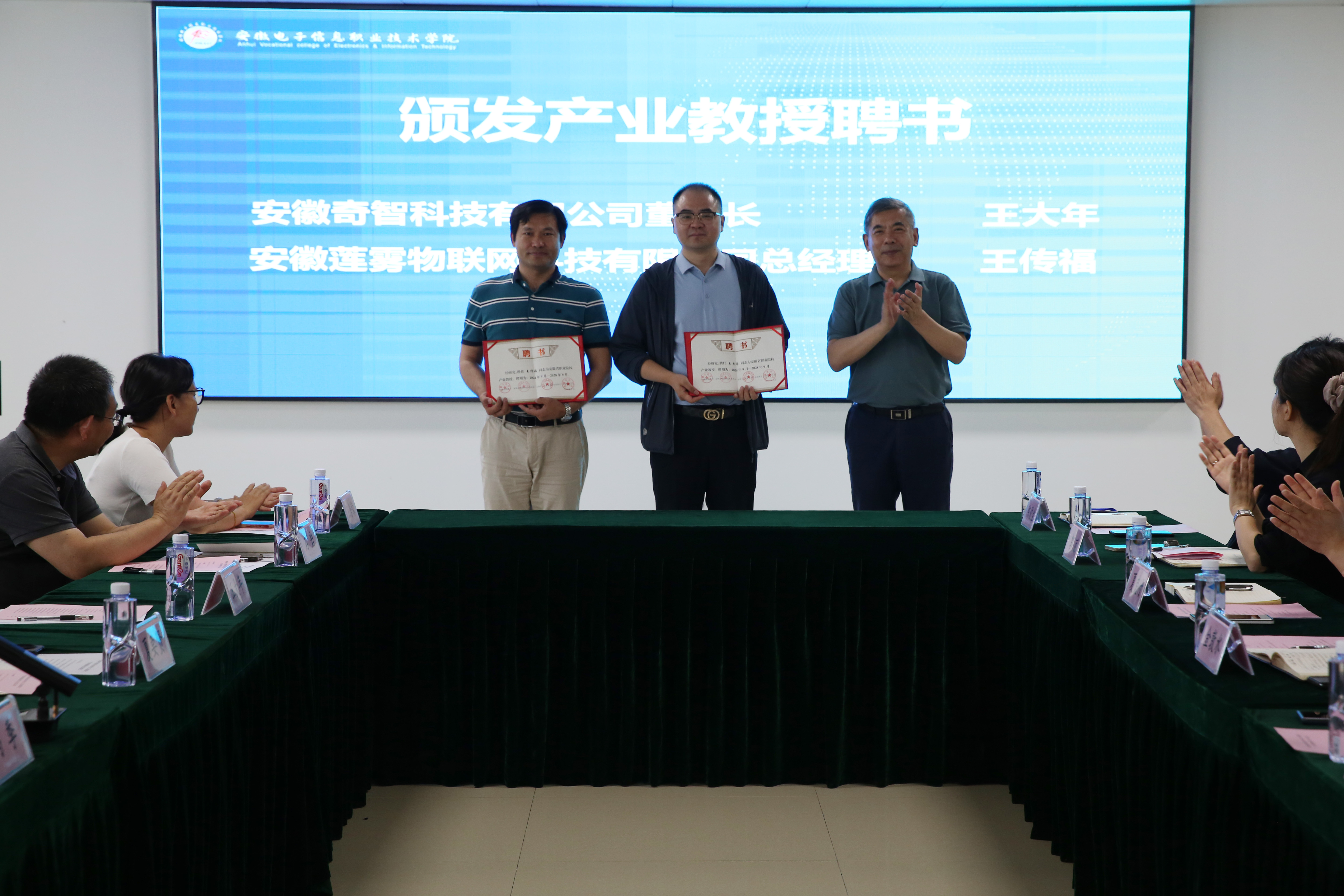 会上,王国武为安徽奇智科技有限公司董事长王大年、安徽莲雾物联网科技有限公司总经理王传福颁发了学院省级产业教授聘书,与理事长马季共同为产业学院新增理事单位颁发了理事聘书。