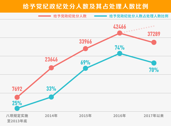 数据显示,2012年12月八项规定实施至2013年底,给予党纪政纪处分0.76万余人,占处理人数的25%;2014年给予党纪政纪处分2.3万余人,占处理人数的33%;2015年给予党纪政纪处分约3.4万人,占处理人数的68%;2016年给予党纪政纪处分4.2万余人,占处理人数的73%;2017年前10个月给予党纪政纪处分3.7万余人,超过去年同期数量,占处理人数的70%。