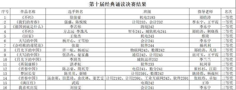 自大赛启动以来,各二级学院积极组织,精心准备,从初赛100余件作品中推荐40部作品进入复赛,最终遴选出16部优秀作品参加本次决赛。参赛作品涵盖中华文明五千年文化精粹,从《不朽》穿越时空的生命叩问,到《我们的青春》朝气蓬勃的成长宣言;从《祖国到底是什么》赤子情怀的深情诠释,到《大写的中国》山河画卷的壮美铺陈,选手们以饱满的热情、生动的语言、自然流畅的肢体动作,完整演绎了每一个作品。本次比赛中同学们创新融入情景表演、配乐朗诵等形式,作品表现方式灵活新颖,令人耳目一新。经过激烈角逐,三组选手荣获一等奖,五组选手获二等奖,八组选手获三等奖。
