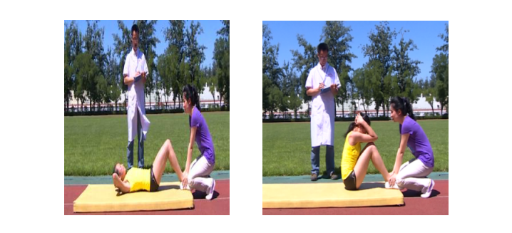 7.1.1 受试者仰卧于软垫上,两腿稍分开,屈膝呈90度,两手手指交叉贴于脑后,同伴按压其踝关节,以固定下肢。