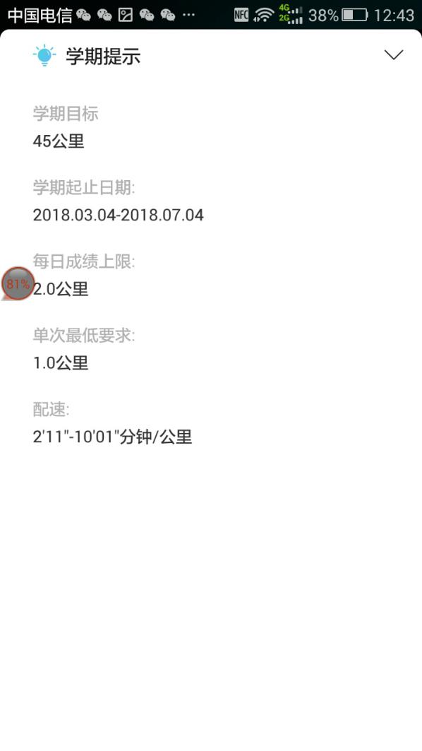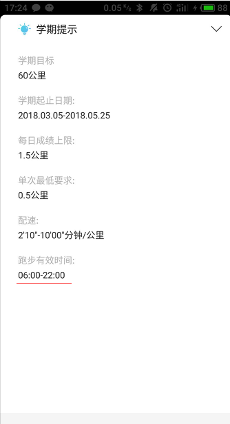 1、学校的每日上限\配速要求\跑步时间,都可以在学期提示里查看:APP必赢766net手机版-最下方-点击箭头进入