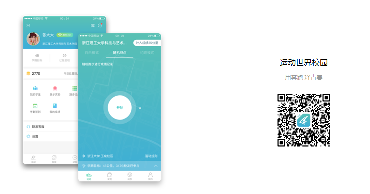 点击“开始跑步”,选择随机终点模式,系统将自动分配5个感应点,经过1个必经点和2个普通点后才能记录成绩。每次晨跑不得少于1公里,用时不得超过20分钟,跑步成绩实时上传。单次跑步未达到最低公里数2公里要求,将不会记录成绩。