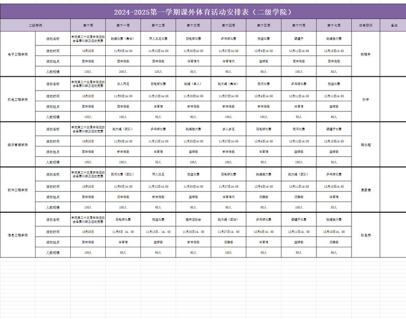 2024-2025第一学期 课外体育活动安排表(二级学院)