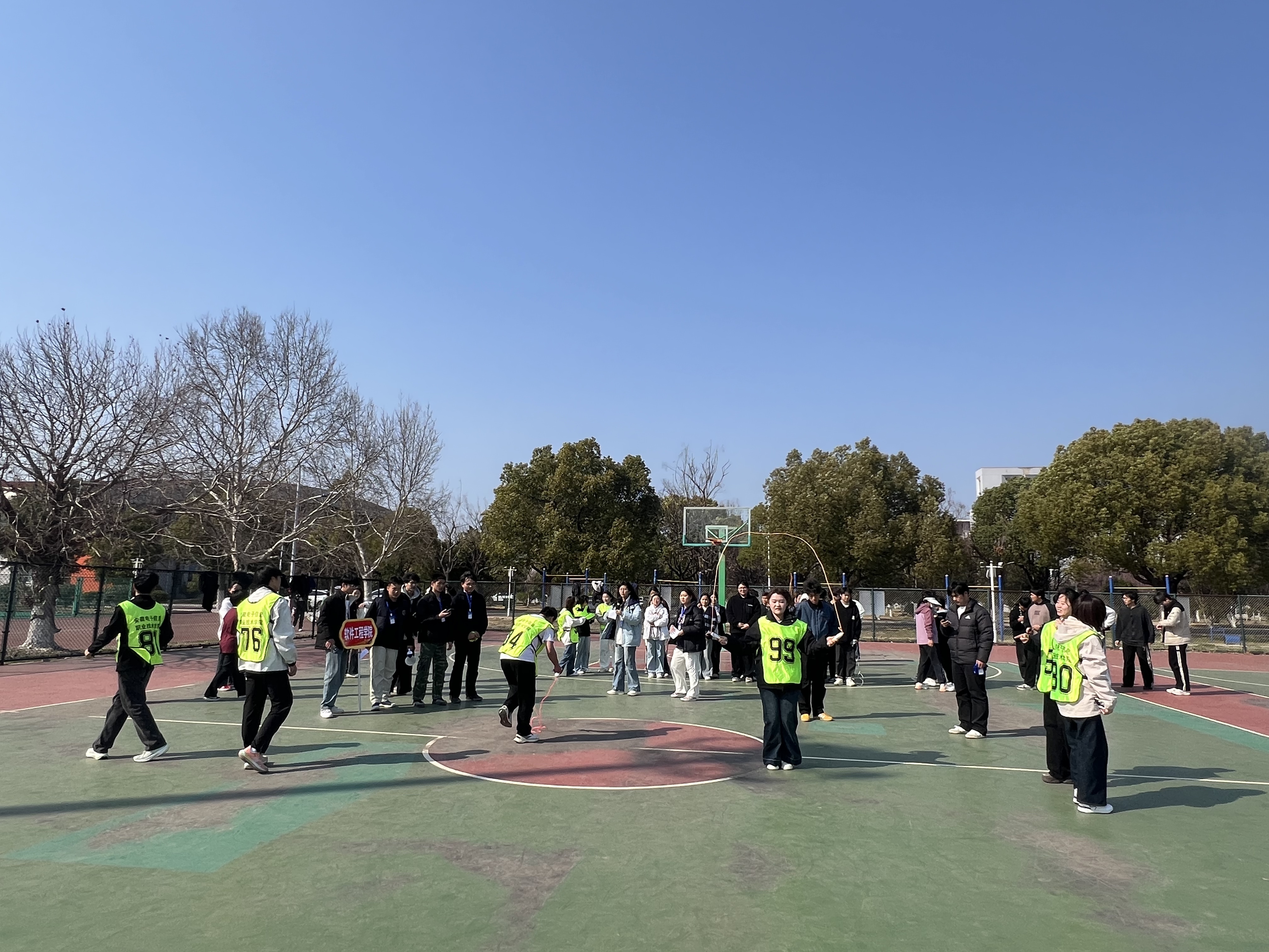 2025年3月19日下午,学院跳绳接力比赛在篮球场火热开展,比赛吸引了众多同学参与,现场气氛热烈。