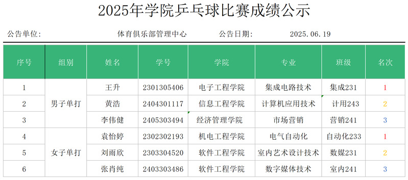 学院2025年乒乓球比赛成绩公告