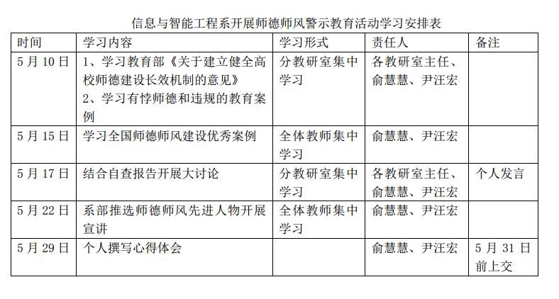 信息与智能工程系开展师德师风警示教育活动学习安排表