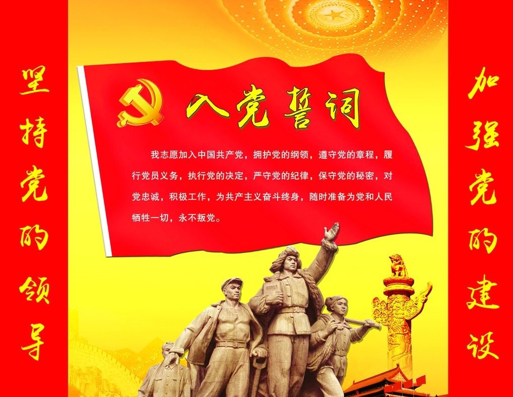 《中国共产党章程》第一章第六条规定:预备党员必须面向党旗进行入党宣誓。誓词如下:“我志愿加入中国共产党,拥护党的纲领,遵守党的章程,履行党员义务,执行党的决定,严守党的纪律,保守党的秘密,对党忠诚,积极工作,为共产主义奋斗终身,随时准备为党和人民牺牲一切,永不叛党。”